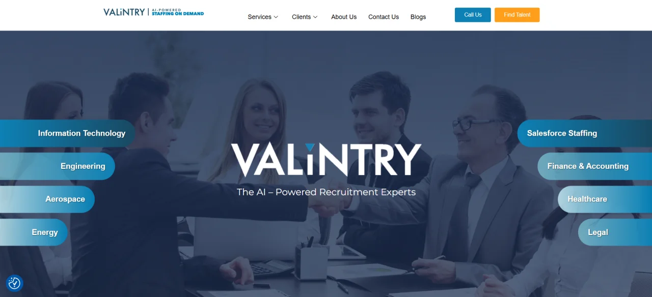 VALiNTRY staffs Salesforce Cloud Administrators, App Developers, Solution Architects, and Cloud Consultants. Their recruitment combines AI-powered analytics with human recruiting expertise to ensure technical and cultural alignment.