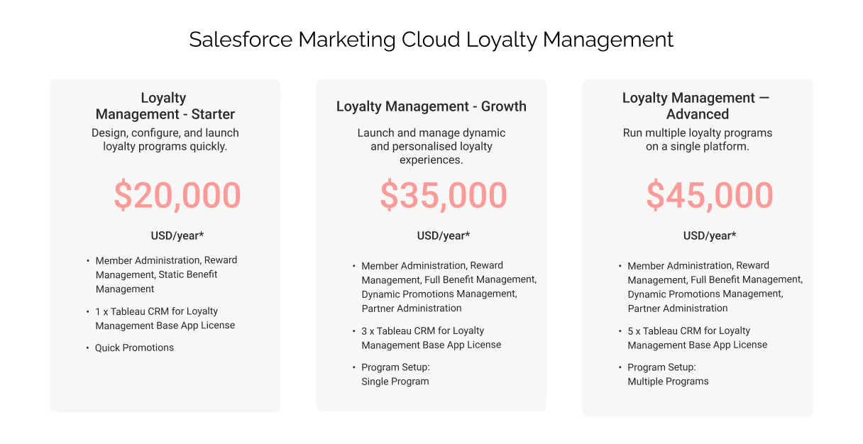 | Starter | $20,000/org/month | – Create, target, and send personalized emails – Design high-quality content that boosts engagement – Centralize member profiles – Track and allocate rewards – Oversee fixed perks – Get loyalty analytics and insights – Launch targeted offers faster |